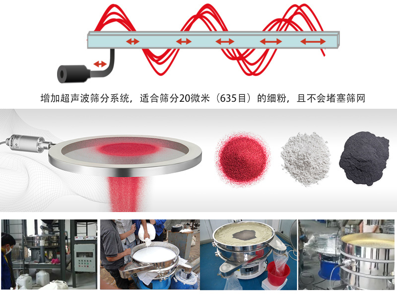 超聲波振動(dòng)篩是在普通振動(dòng)篩的基礎(chǔ)上增加了超聲波系統(tǒng),對(duì)篩子施加超聲波頻率,可篩分20微米(635目)的細(xì)粉,且不會(huì)堵塞或堵塞孔徑,它還可以提高產(chǎn)量并減少清潔時(shí)間。與普通振動(dòng)篩相比,篩分精度提高1-70%,產(chǎn)量可提高0.5-10倍。解決了強(qiáng)吸附、靜電、強(qiáng)粘度、高密度的問題,減少篩網(wǎng)堵塞, 目前已廣泛應(yīng)用于面粉、石墨粉、橡膠粉、石英砂粉、金屬粉末、粉末涂料、熒光粉等細(xì)粉的篩選。